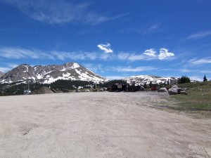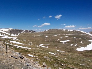 Where it was north of 90 degrees in Boulder, it was a crisp 53 degrees (highest temp of record at the top was 65 degrees) at the parking lot at the top of the road (which is a small bit below the actual top). The top is significantly above the tree line and there was still a fair amount of snow around. The 9,000 foot difference from Boulder meant that a small amount of exertion left one breathing heavy; this can make one feel like a whimp when one witnesses the 50-60 people riding their bikes up the mountain. And the road has no guardrails, no line and is just slightly wider than two cars.